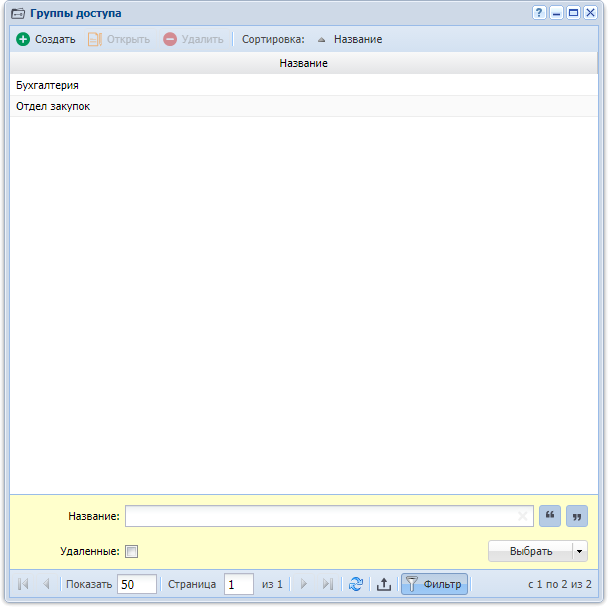 Модуль «Группы доступа», представленный на рисунке ниже, позволяет выполнять поиск групп доступа, а также создавать, открывать на редактирование и удалять группы доступа.