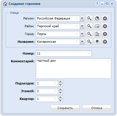 Если создание строения осуществляется из модуля редактирования улицы (со вкладки «Строения»), то улица выбирается автоматически, поля заблокированы от изменения.