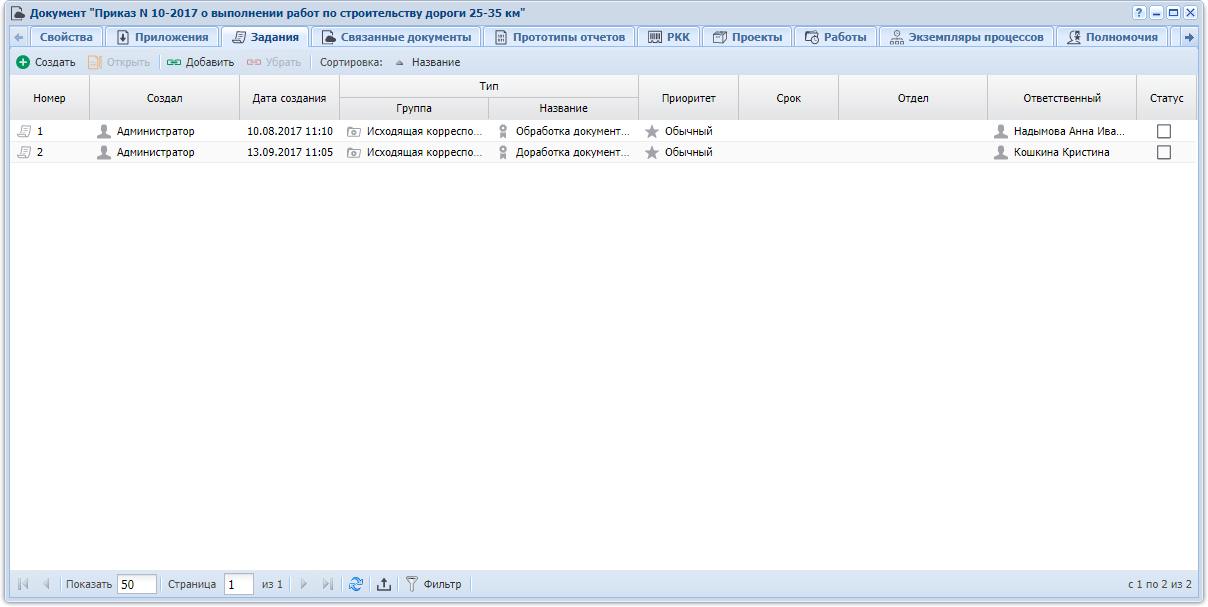 Задания — просмотрите и при необходимости отредактируйте перечень заданий, связанных с документом. Работа с этой вкладкой осуществляется так же, как с сервисным модулем «Задания у документов». Можно открыть его, нажав кнопку «Фильтр». Кроме того, доступны операции создания заданий и открытия их на редактирование (кнопки «Создать» и «Открыть»). Эти операции выполняются так же, как при работе с основным модулем «Задания» (подсистемы CRM и BPM).
