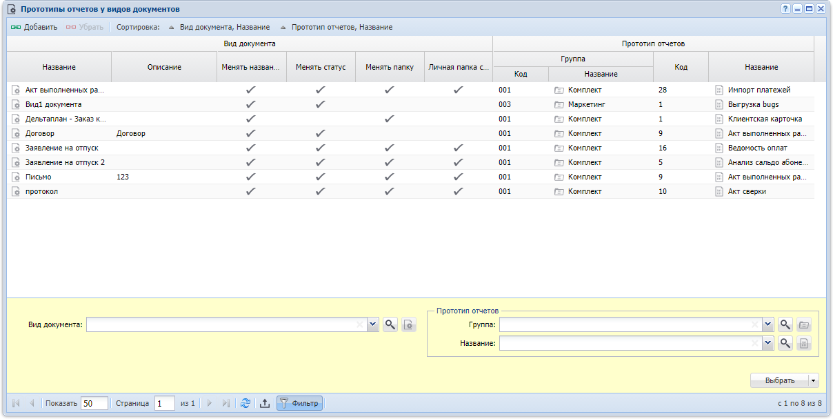 Чтобы открыть модуль «Прототипы отчетов у видов документов», откройте любой из видов документов на редактирование, перейдите на вкладку «Прототипы отчетов» и нажмите кнопку «Фильтр».