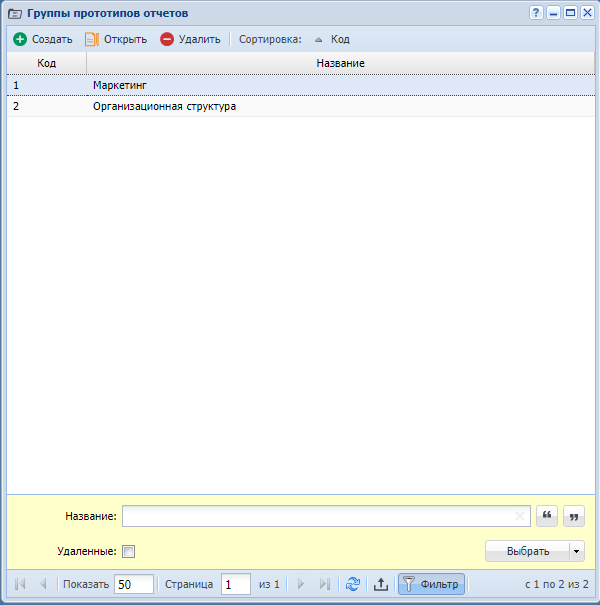 Модуль «Группы прототипов отчетов», представленный на рисунке ниже, позволяет выполнять следующие операции:
